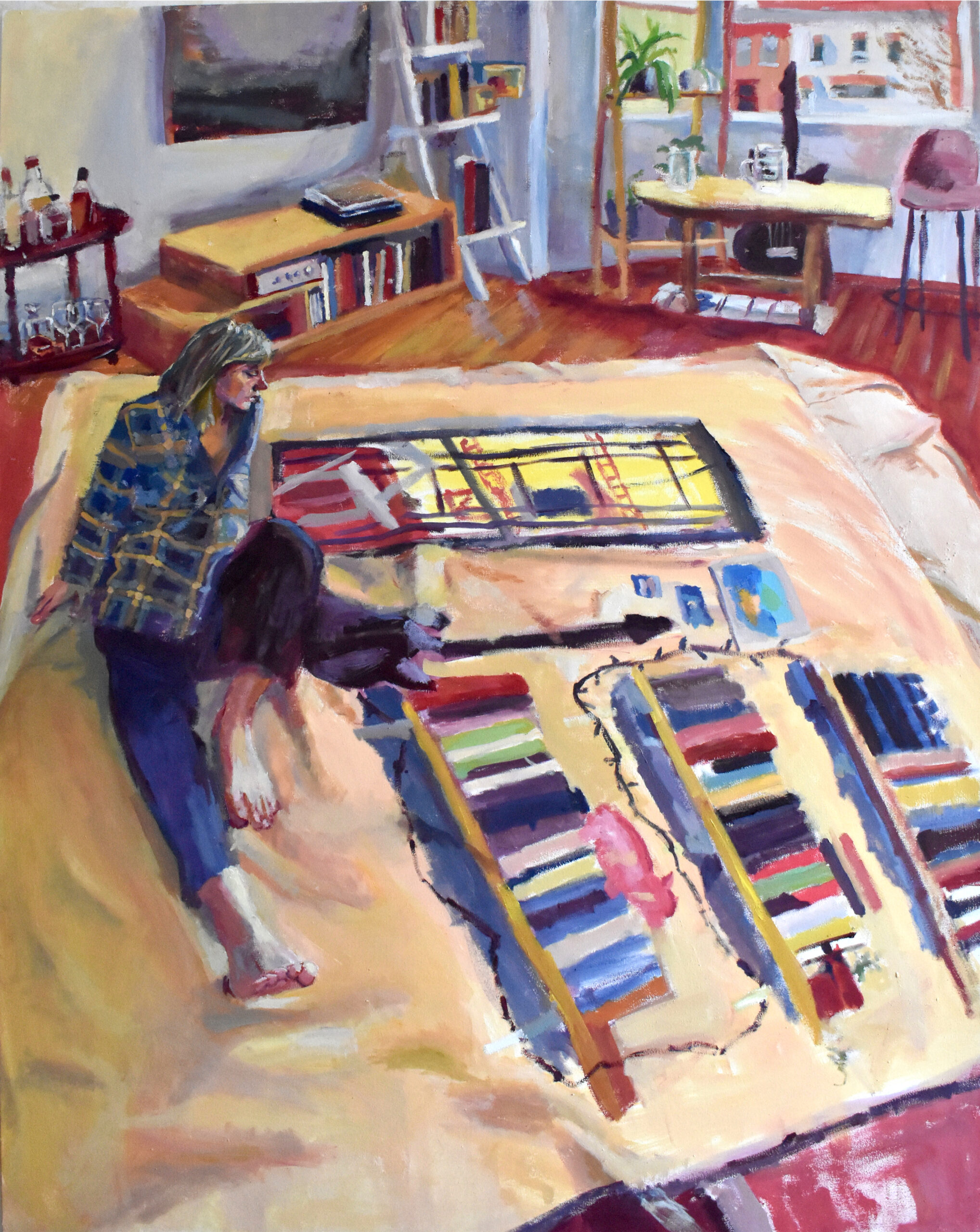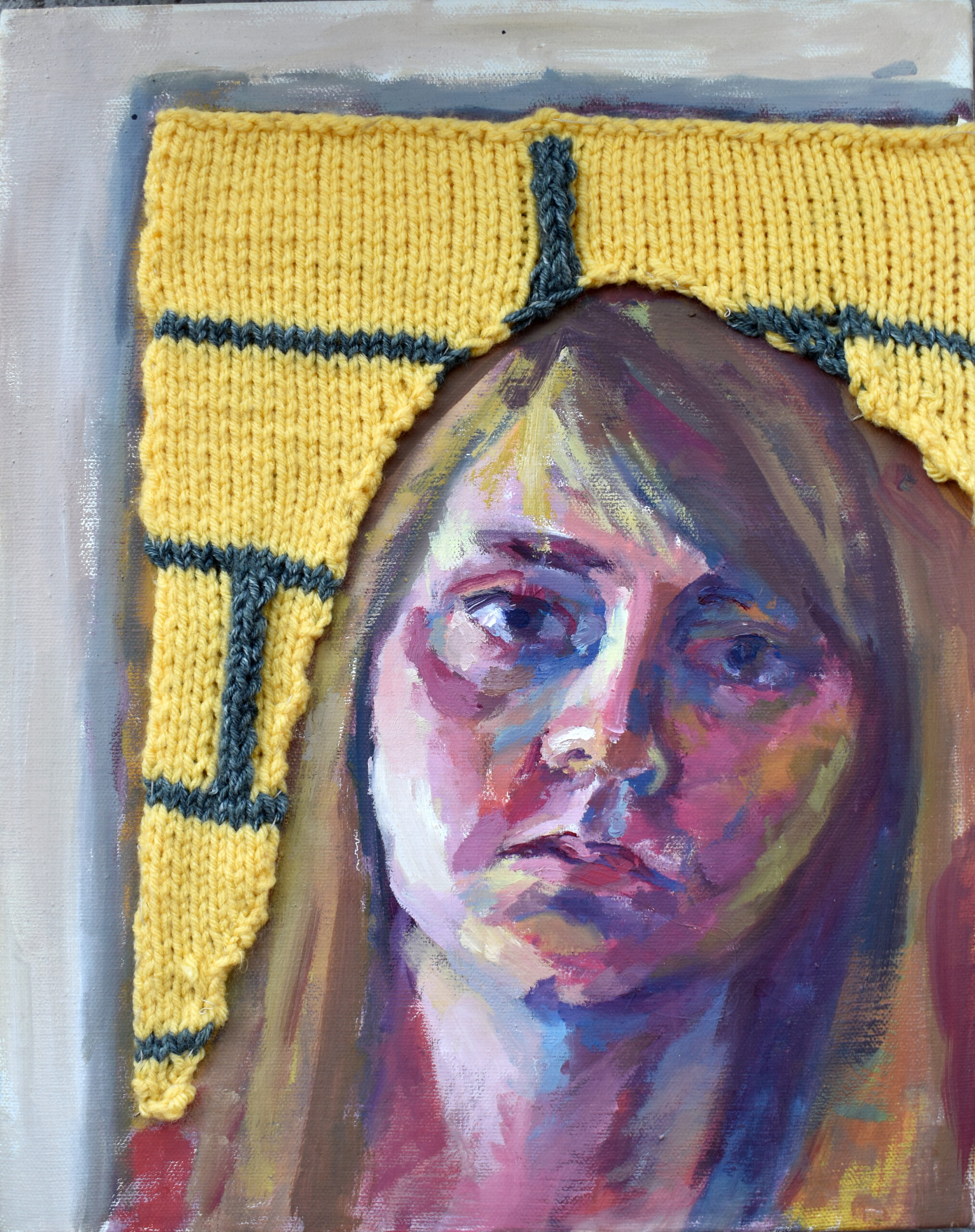 Self Portrait with Bricks, 16 x 12, Oil and hand knit acrylic yarn on canvas