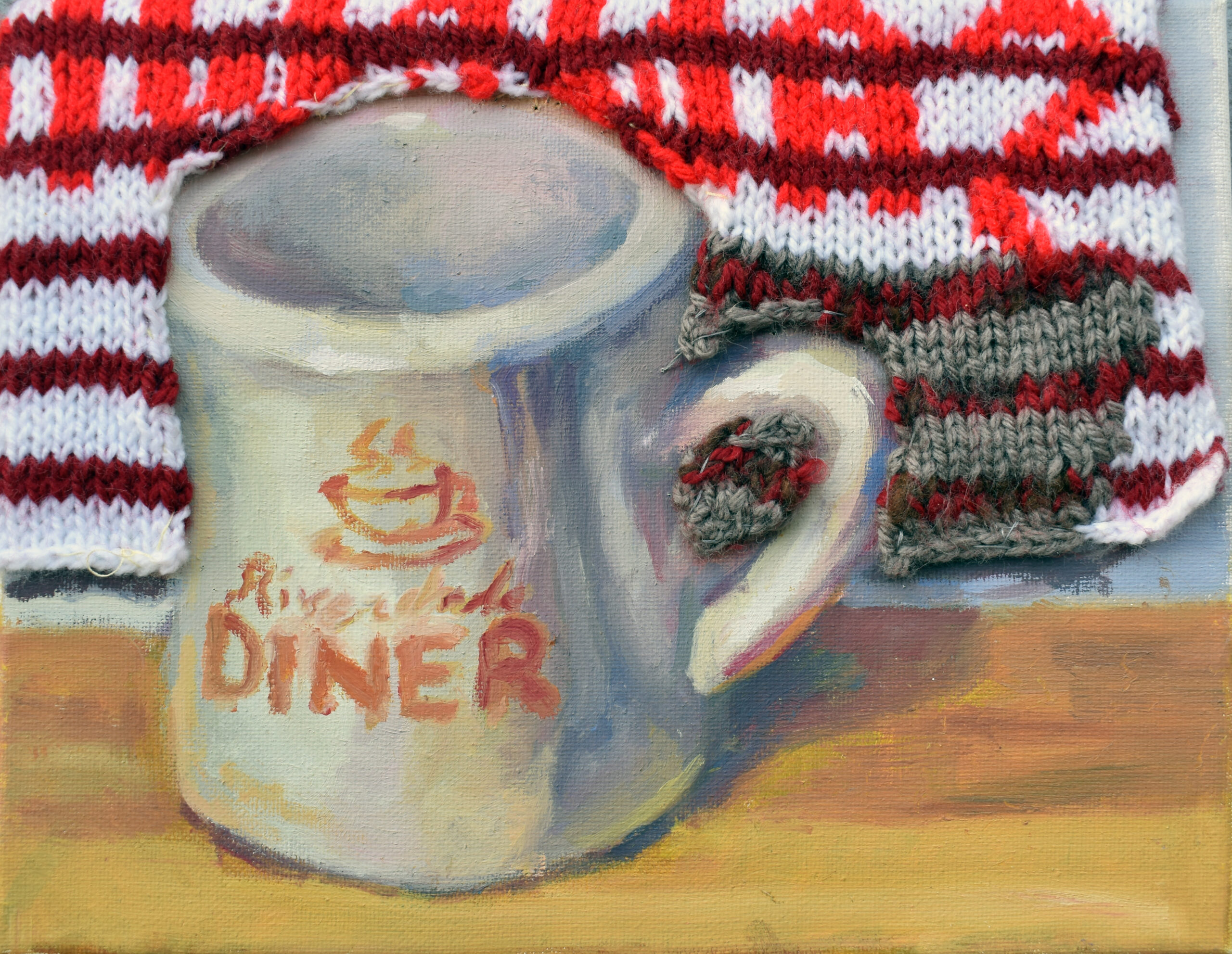 In the Diner, 8 x 10, Oil and hand knit acrylic yarn on canvas